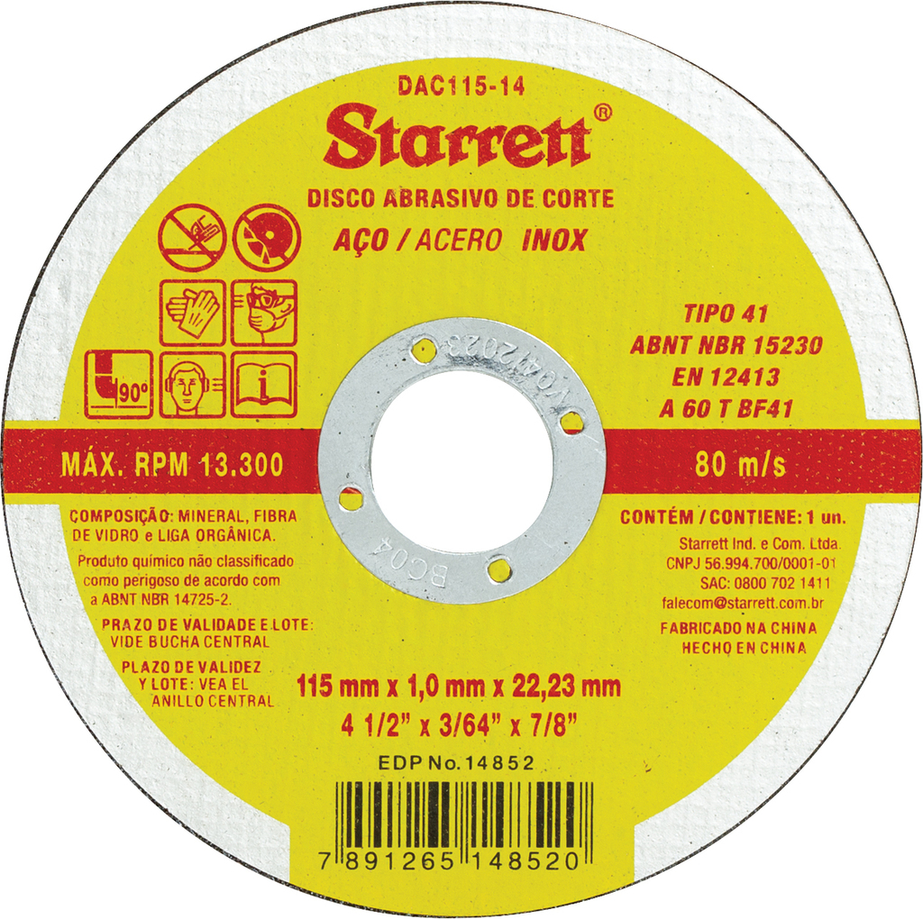 Disco de Corte Fino para Aço Inox 115x1mm Starrett é a escolha ideal para serralheiros e profissionais que buscam precisão e qualidade em cortes. Especialmente desenvolvido para cortar barras, tubos, chapas metálicas, aço carbono e aço inox, oferece um acabamento fino e detalhado, garantindo a excelência em cada operação.